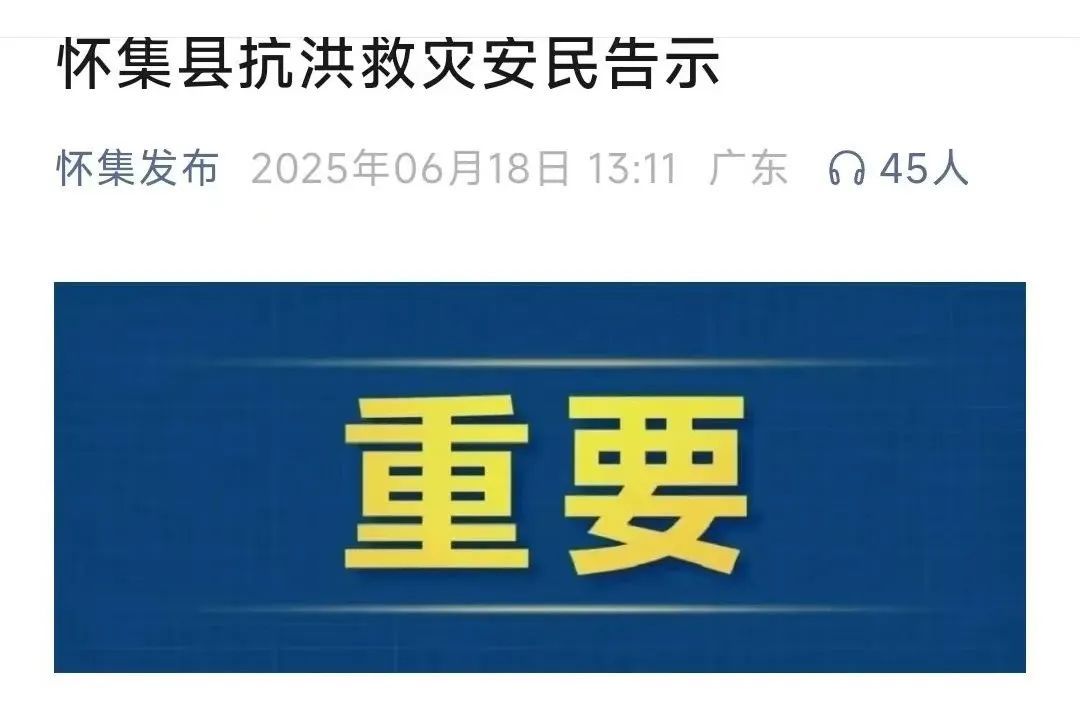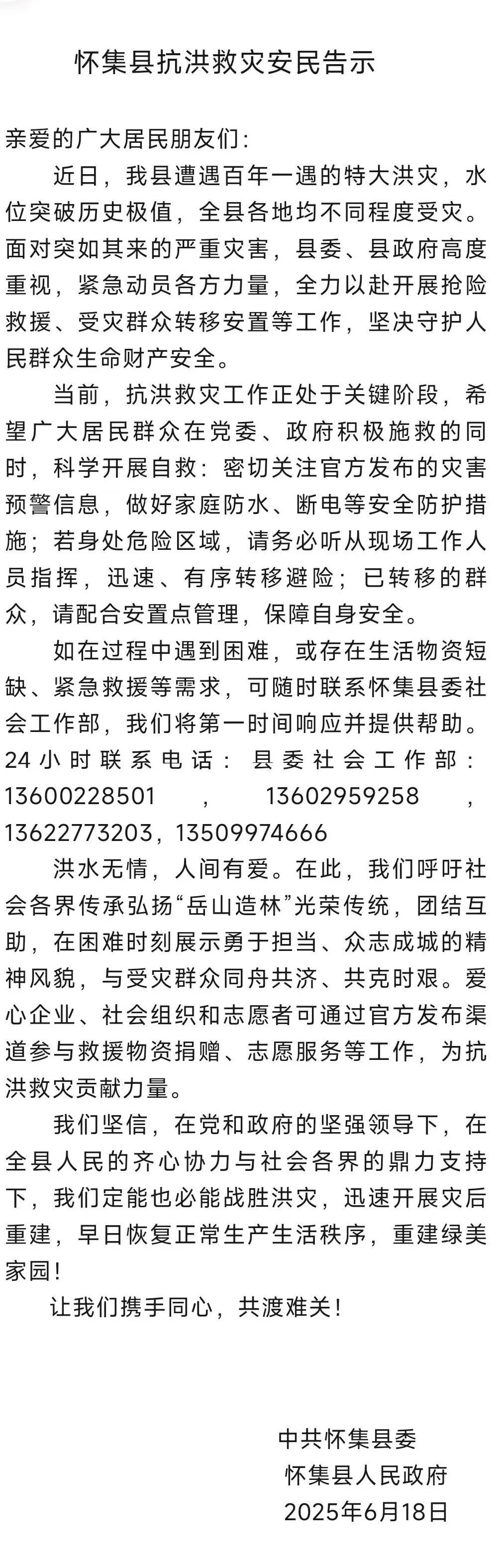 6月18日中午,怀集县发布的抗洪救灾安民告示。截图来源:怀集发布