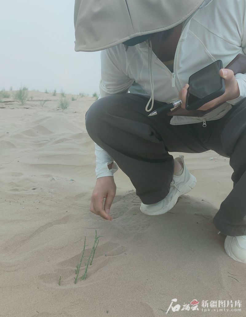 6月16日,在巴楚县琼库尔恰克乡温阿勒台库什村的广袤沙漠中,“环着沙漠看新疆”全媒体报道团队的记者围着一株梭梭树苗,难掩惊喜。这株今年3月种下的梭梭苗,此前已经被风沙掩埋,若不是记者行走沙丘时意外踢开沙土,它仍将“沉睡”在黄沙下。