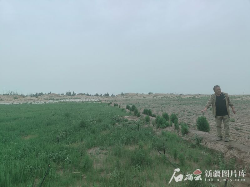 6月16日,戴志刚站在苗圃地旁,介绍培育出的各类经济作物苗。石榴云/新疆日报记者 加孜拉·泥斯拜克摄