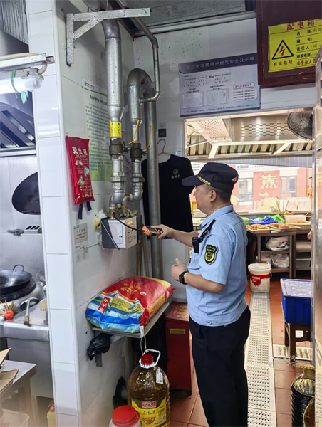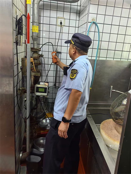 此外,街道执法中心胡斌队长带领执法队员对泛悦汇商圈开展燃气安全专项检查。检查过程中,检查人员携带可燃气体检测仪,对餐饮商户的燃气表、波纹管、熄火保护装置等关键部位进行逐项检测,同时对燃气使用环境、消防设施配备等情况进行了仔细检查。
