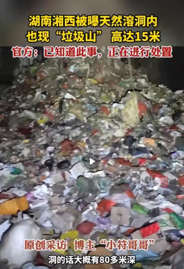 发布视频的博主“小符哥哥”称,他是接到粉丝的线索探访了这处溶洞,他用专业的探洞设备发现,约80米深的溶洞底部有一座直径约30米、高15米的锥形“垃圾山”,其中有塑料袋、纸箱、水瓶等各种生活垃圾,有些垃圾疑似是最近才进行的倾倒,溶洞内恶臭味强烈,蚊蝇滋生,还有地下水从垃圾上流过。据他了解,该溶洞属于喀斯特地貌。