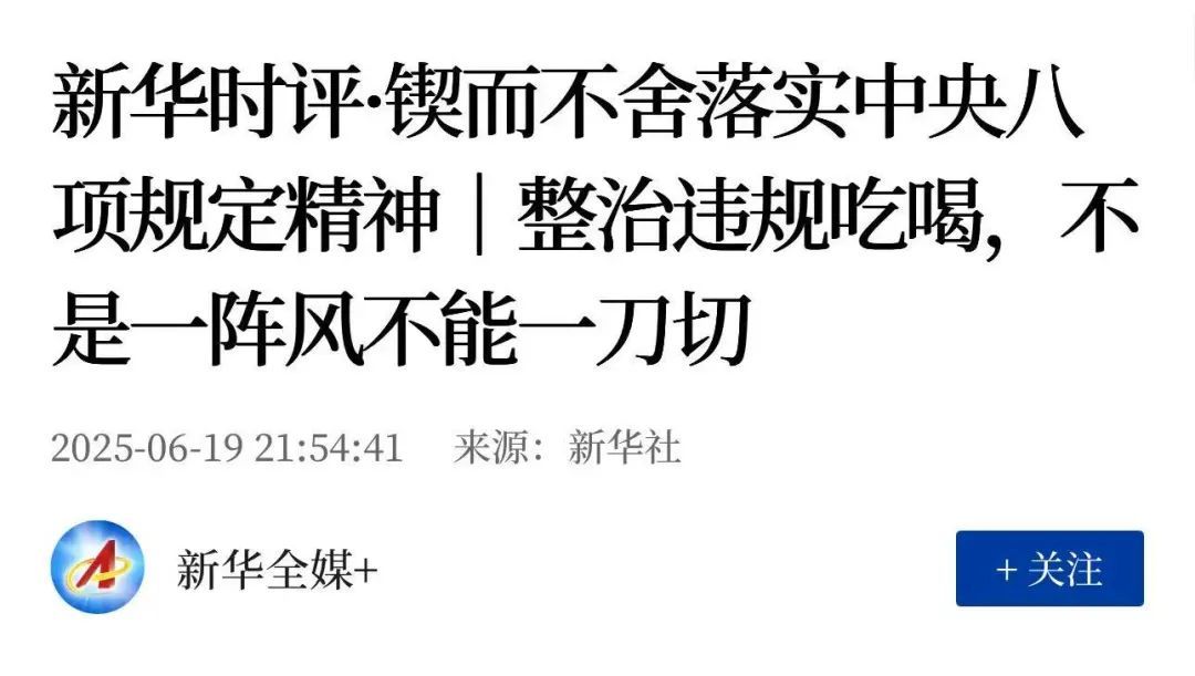 6月19日,新华社发布时评《整治违规吃喝,不是一阵风不能一刀切》。