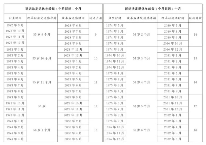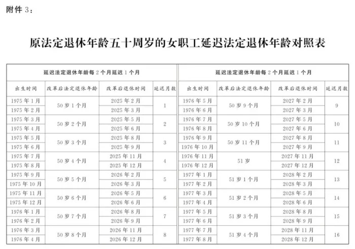 女职工延迟法定退休年龄对照表