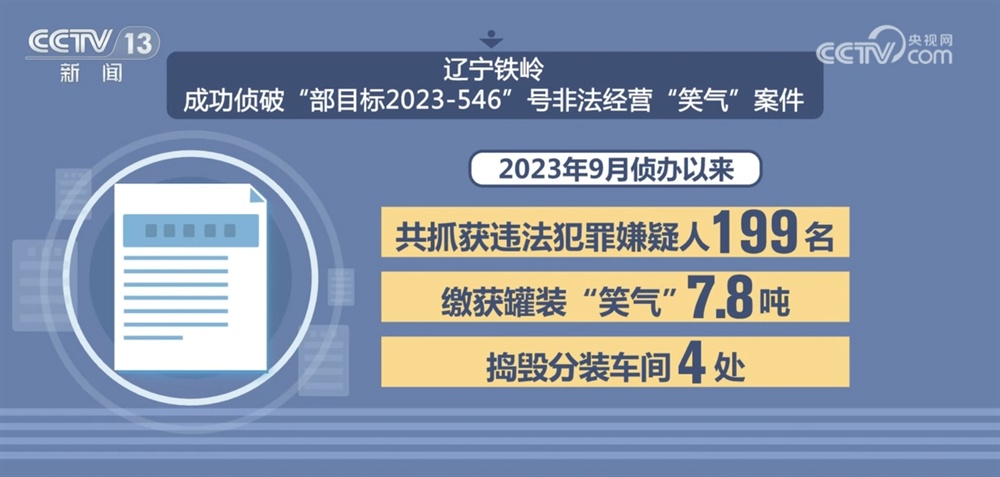 三、辽宁铁岭成功侦破“部目标2023-546”号非法经营“笑气”案件。2023年9月侦办以来,共抓获违法犯罪嫌疑人199名,缴获罐装“笑气”7.8吨,捣毁分装车间4处、存储窝点5处,查处非法经营“笑气”企业4家,有力打击了涉“笑气”违法犯罪活动。