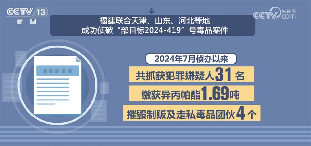 四、福建联合天津、山东、河北等地成功侦破“部目标2024-419”号毒品案件。2024年7月侦办以来,共抓获犯罪嫌疑人31名,缴获异丙帕酯1.69吨,摧毁制贩及走私毒品团伙4个,捣毁制毒窝点2处、毒品仓库3处,查扣毒资170.8万元,系国内列管异丙帕酯后首起实现全链条打击案件。