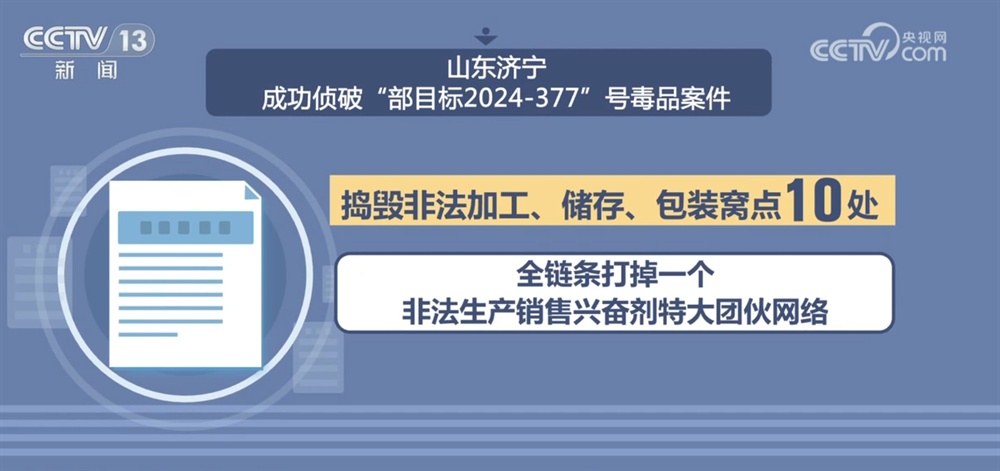 六、山东济宁成功侦破“部目标2024-377”号毒品案件。2023年9月侦办以来,共抓获犯罪嫌疑人37名,缴获各类兴奋剂及原料上百吨、反应釜31套,捣毁非法加工、储存、包装窝点10处,全链条打掉一个非法生产销售兴奋剂特大团伙网络。