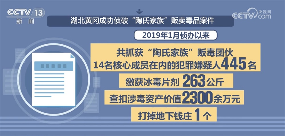 七、湖北黄冈成功侦破“陶氏家族”贩卖毒品案件。2019年1月侦办以来,共抓获“陶氏家族”贩毒团伙14名核心成员在内的犯罪嫌疑人445名,缴获冰毒片剂263公斤,查扣涉毒资产价值2300余万元,打掉地下钱庄1个。2025年1月开展跨国执法合作抓获该案主犯陶某坤,标志着以陶某坤为首的家族式特大贩毒团伙彻底覆灭。