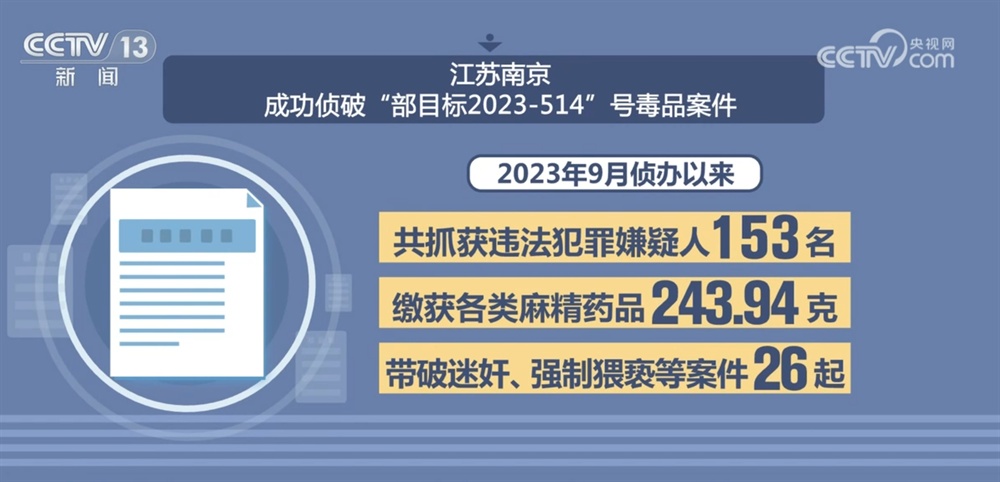二、江苏南京成功侦破“部目标2023-514”号毒品案件。2023年9月侦办以来,共抓获违法犯罪嫌疑人153名,缴获各类麻精药品243.94克,带破迷奸、强制猥亵等案件26起,阻止预谋实施强制猥亵、强奸等违法犯罪案件70余起,摧毁了一个涉及毒品、强奸、猥亵等多类型违法犯罪团伙。