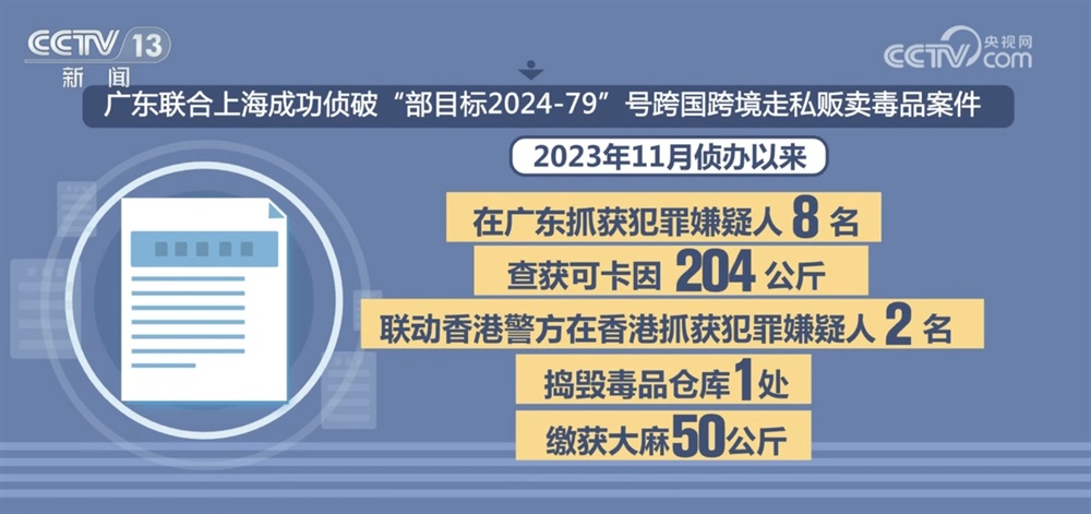 八、广东联合上海成功侦破“部目标2024-79”号跨国跨境走私贩卖毒品案件。2023年11月侦办以来,在广东抓获犯罪嫌疑人8名,查获可卡因204公斤,联动香港警方在香港抓获犯罪嫌疑人2名,捣毁毒品仓库1处,缴获大麻50公斤,切断了一条从南美国家通过货运夹藏经我国中转过境的毒品走私通道。