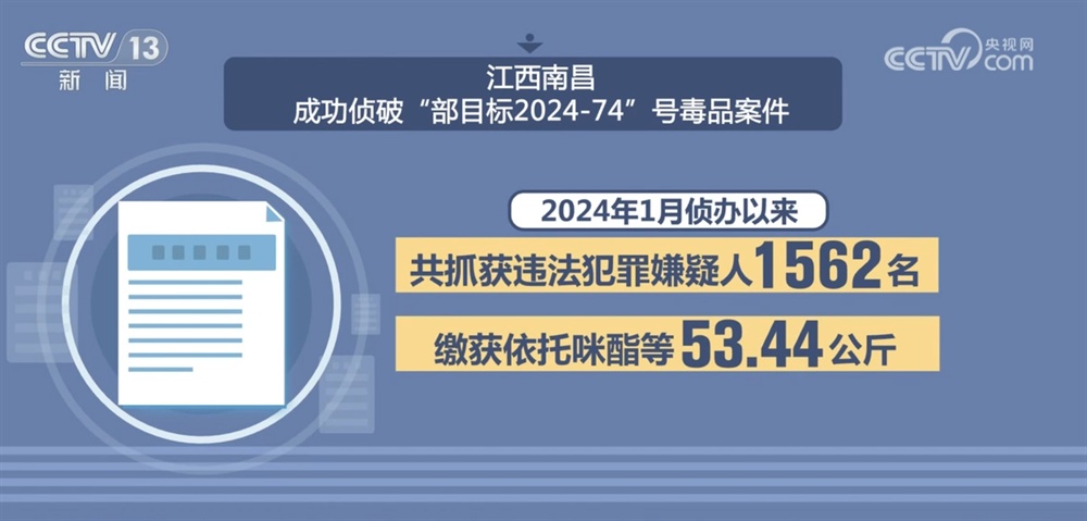 五、江西南昌成功侦破“部目标2024-74”号毒品案件。2024年1月侦办以来,共抓获违法犯罪嫌疑人1562名,缴获依托咪酯等53.44公斤,捣毁电子烟弹加工窝点11个,查扣、冻结毒资131万元,成功打掉一个涉及多省制造、运输、贩卖依托咪酯特大网络。