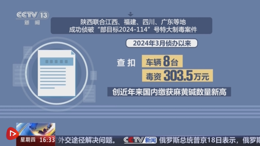 十、陕西联合江西、福建、四川、广东等地成功侦破“部目标2024-114”号特大制毒案件。2024年3月侦办以来,共抓获犯罪嫌疑人43名,缴获麻黄碱4.16吨、化工原料9吨、玻璃反应釜8套,捣毁非法生产麻黄碱工厂1处、原料及藏毒仓库3处,查扣车辆8台、毒资303.5万元,创近年来国内缴获麻黄碱数量新高。