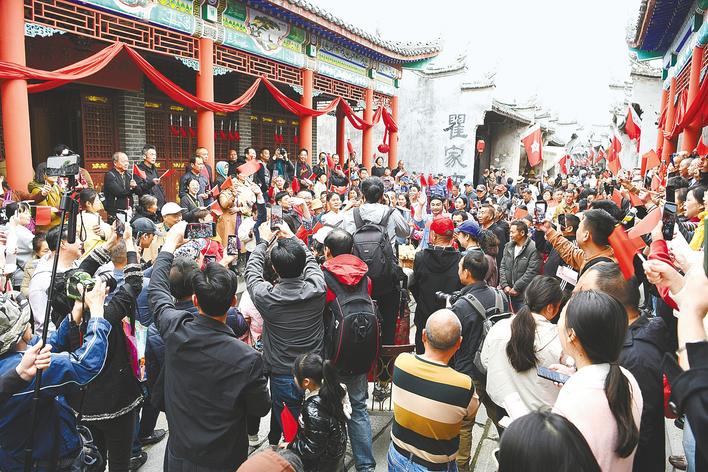 4月12日,洪湖市瞿家湾镇红军街“春满洪湖岸,红动瞿家湾”主题游活动现场人头攒动。 (湖北日报通讯员 王欣 摄)
