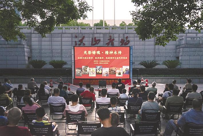6月13日晚,武汉市洪山广场电影公益放映点,由省委宣传部指导,湖北长江电影集团主办的“光影铸魂·精神永传”弘扬三大精神公益电影展映活动与广大影迷见面。从6月初开始,我省举办三大精神主题电影进校园、进社区、进机关、进企业、进乡村、进广场等展映活动,计划年内开展1万场专题放映。(湖北日报全媒记者 文新 通讯员 张振华 王娟 摄)