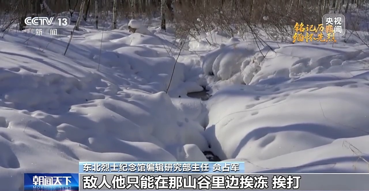 东北烈士纪念馆编辑研究部主任 贠占军:山谷上面有一个泉子,咱们东北话叫“沿流水”。就是泉水淌下谷底冻上之后像一面镜子一样,人在那走路是很费劲的,站不稳。敌人他只能在那山谷里边挨冻、挨打。