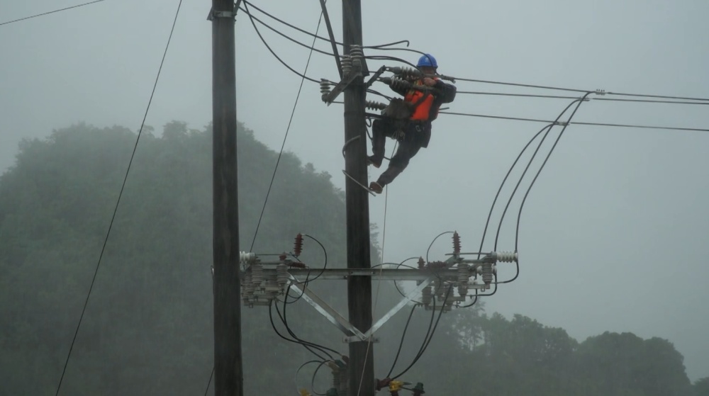 在宣恩县沙道沟镇,供电抢修人员连续奋战6小时,开展立电杆、接线等工作,确保受灾地区民生用电。