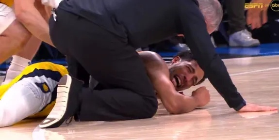 首节比赛,他在无对抗情况下重重摔倒,表情痛苦,在地板上连连捶击。随后,他被队友搀扶离场,并未再回归。据其父亲向美媒透露,伤情疑似为跟腱损伤,尚待进一步确认。