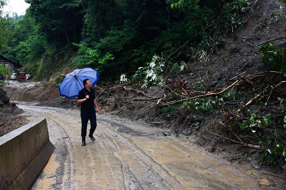 当晚10点,更猛烈的强降雨导致四官线汪家台路段发生大面积塌方,阻断交通。村委会主任陈佳红冒雨赶到现场,确认车辆无法通行后,第一时间在村民群发布道路中断信息,并上报太平镇公路中心。