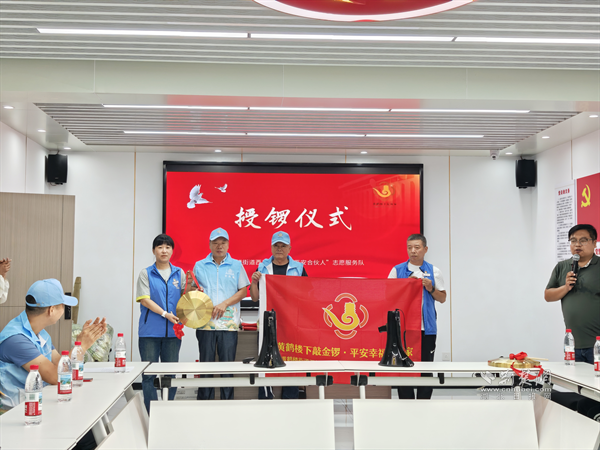 随着现场气氛逐渐升温,“平安合伙人”授锣仪式正式开始。社区负责人郑重地将金灿灿的铜锣和鲜艳的队旗,递到志愿服务队代表手中。“金锣是责任,更是信任,希望大家齐心协力,守护社区平安。”全体人员集体宣誓,承诺积极参与社区治理,为社区平安建设贡献自己的力量。