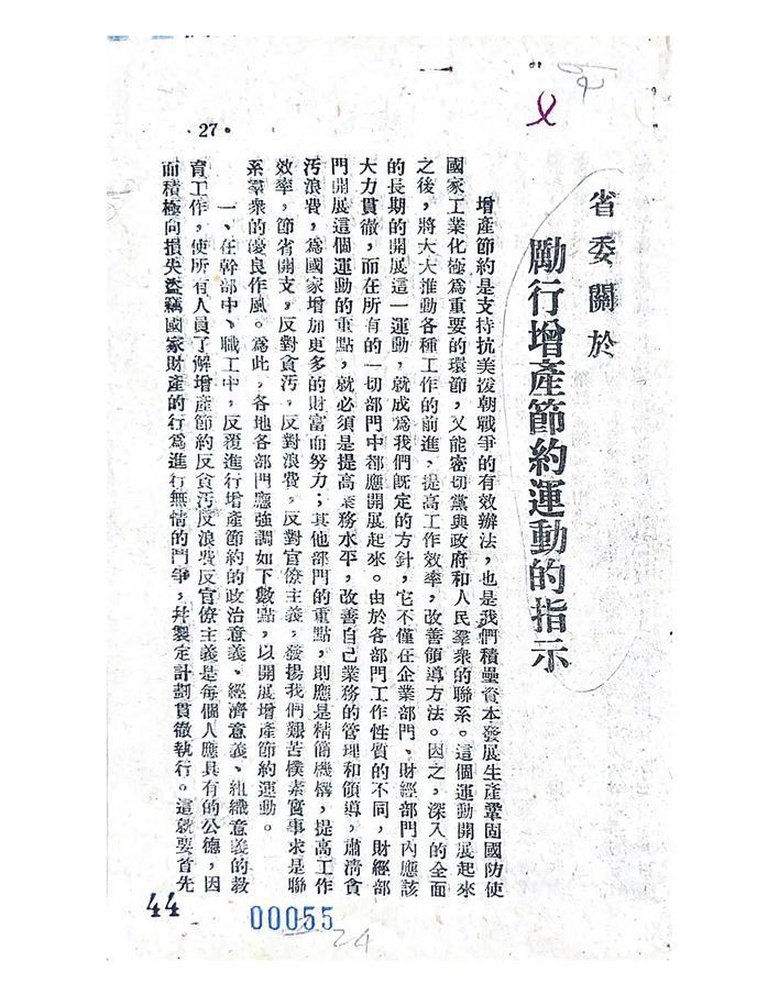 “当时,省委认为,增产节约是支持抗美援朝战争的有效办法,也是积累资本、发展生产、巩固国防和实现工业化的极为重要的环节。”省档案馆档案开发利用处相关负责人说。