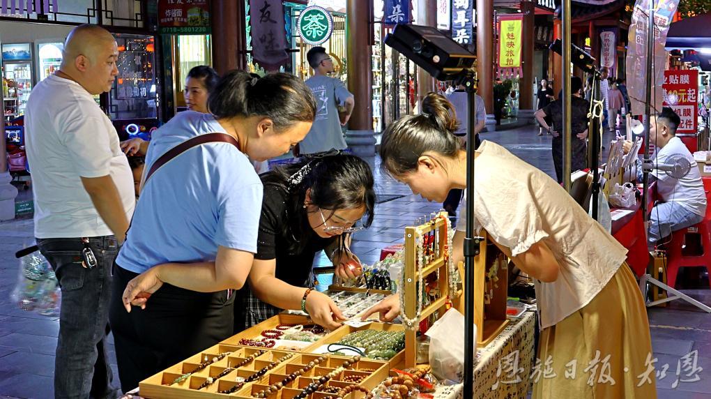 夜幕降临,贡水河两岸华灯璀璨,“一元摊”夜市人潮涌动。冷饮摊、工艺品铺、糖画艺人……此起彼伏的吆喝声中,游客举着手机拍照打卡。“这里有吃有玩,充满生活气息!”大家对此赞不绝口。