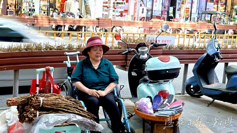在贡水路,常能看到一位坐着轮椅的老太太。她叫张彩云,是长潭河人,年近七旬的她因病行动不便,在这里摆摊售卖手工鞋垫,“固定摊位让我们有了生计来源。”她说。