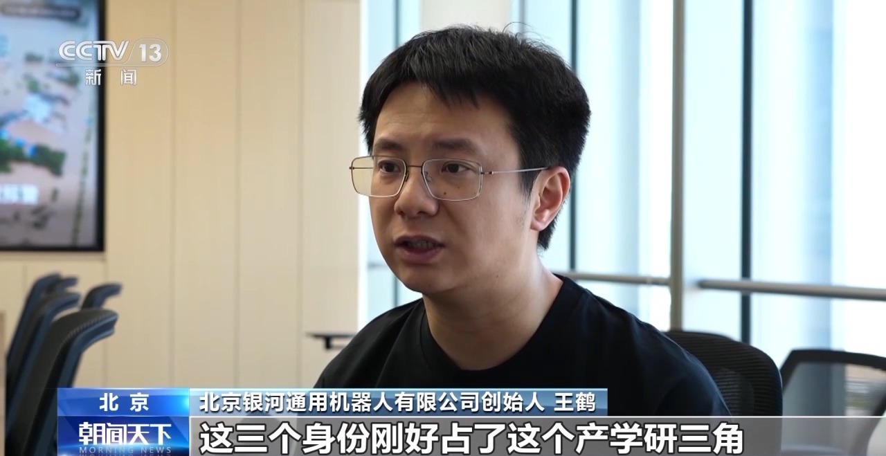 北京银河通用机器人有限公司创始人 王鹤:这三个身份刚好占了产学研三角,这样的一个身份其实让我更加能看到怎么把产学研三个不同的视角,三种不同的力量团结在一起。