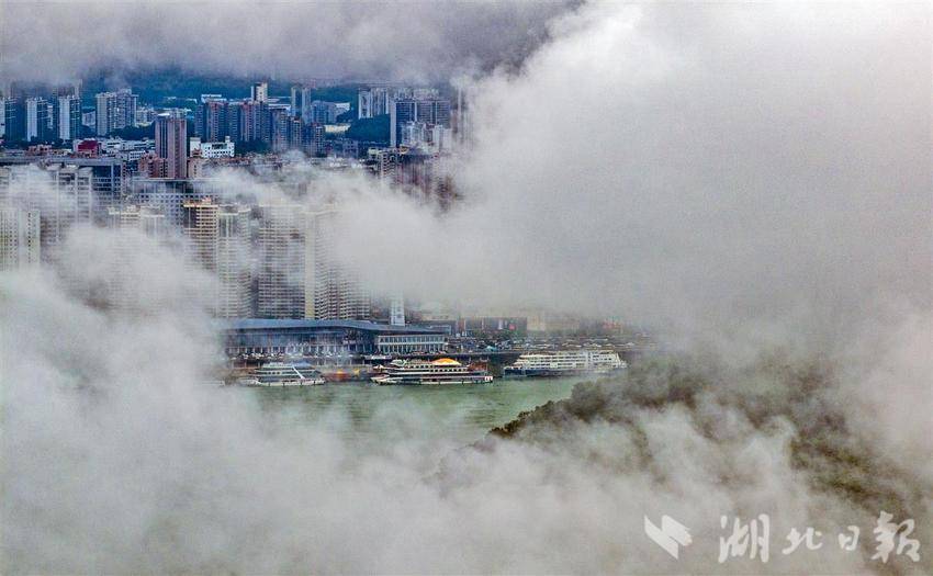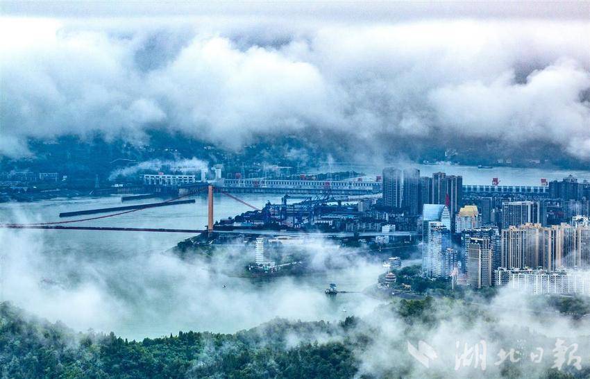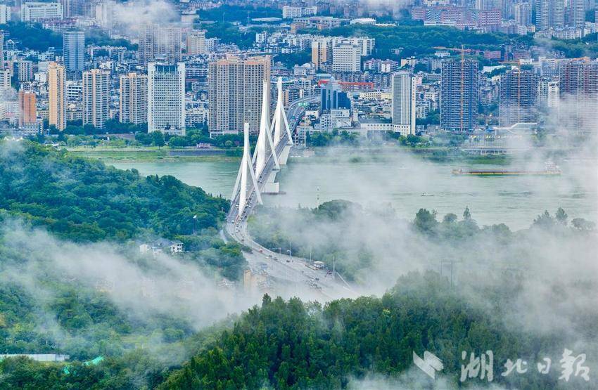 6 月 26 日清晨,宜昌持续降雨,长江与城市在云雾中相映成趣,朦胧间别有韵味。为防本轮降雨引发灾害,宜昌多部门联动应对,目前,市民雨中出行秩序井然。(湖北日报全媒记者 刘曙松 摄)