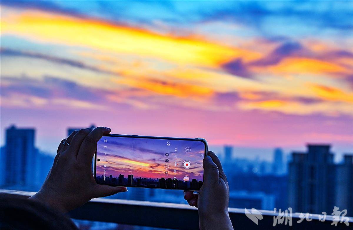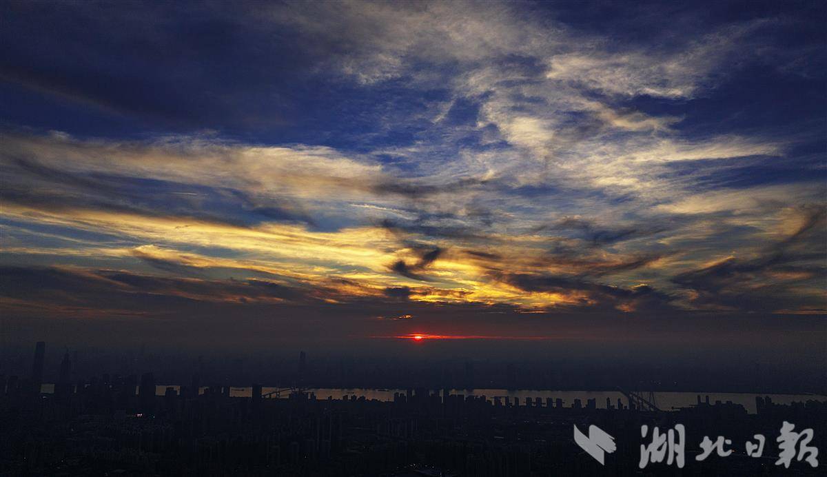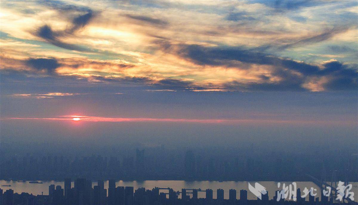 6月16日傍晚七时许,夕阳缓缓西沉,将武汉城市天际线勾勒出一道柔和的金边。炽烈的日光渐次收敛,取而代之的是漫天绚烂的晚霞。绯红与橙紫交织,如同画家精心调配的油彩,在天幕上晕染开来,将层层叠叠的暮云浸染得瑰丽非凡。长江两岸林立的高楼静默伫立。随着暮色渐浓,这座城市即将告别白日的喧嚣,迎来华灯初上的璀璨夜色。(湖北日报全媒记者 朱熙勇摄)