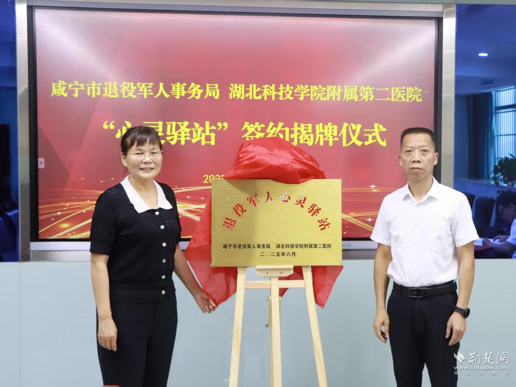 荆楚网(湖北日报网)讯(通讯员常梦星)6月26日上午,咸宁市退役军人心灵驿站签约和揭牌仪式在湖北科技学院附属第二医院举行。驿站由咸宁市退役军人事务局和湖北科技学院附属第二医院联合打造,旨在整合双方优势资源,共同打造一个专业化的心理健康服务平台。
