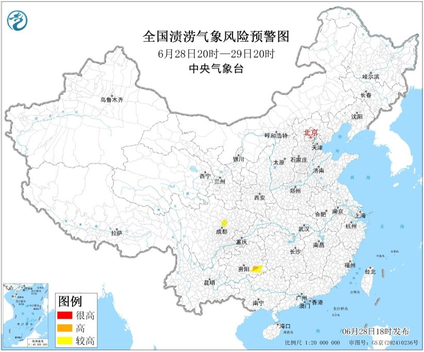 预计,6月28日20时至29日20时,四川北部、贵州东南部、甘肃南部等地部分地区发生山洪灾害可能性较大(黄色预警),局地发生山洪灾害可能性大(橙色预警)。其他地区也可能因局地短历时强降水引发山洪灾害,请各地注意做好实时监测、防汛预警和转移避险等防范工作。
