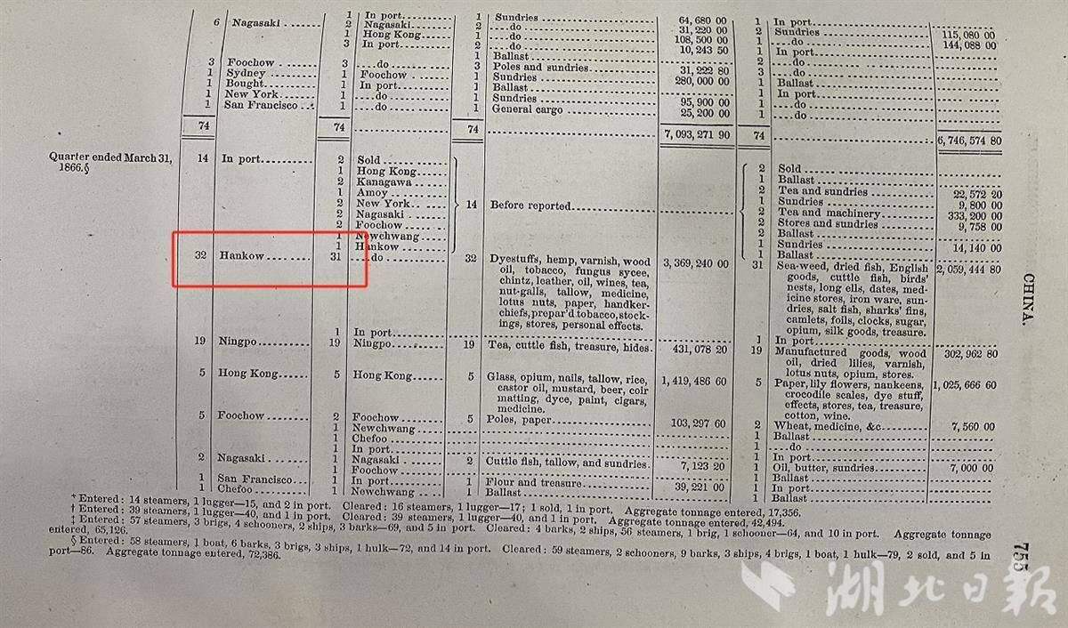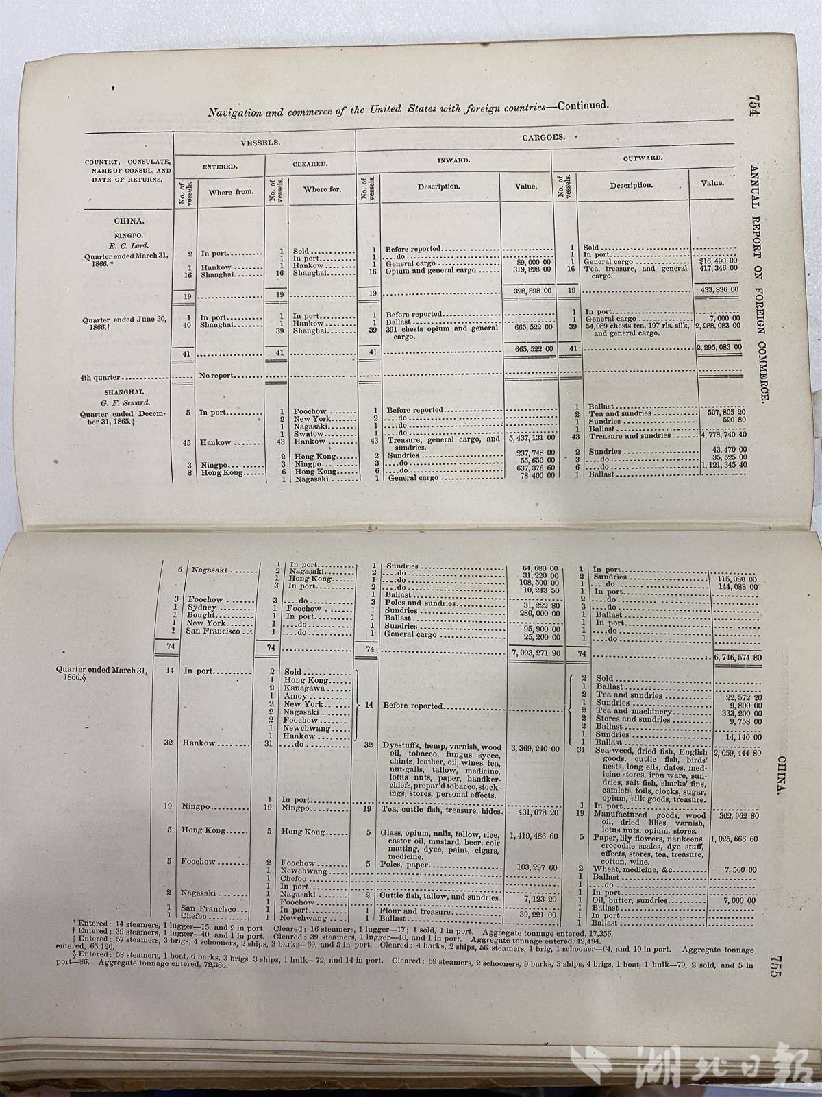 1866年一季度,汉口对美国的贸易数据。(湖北日报全媒记者刘天纵摄)