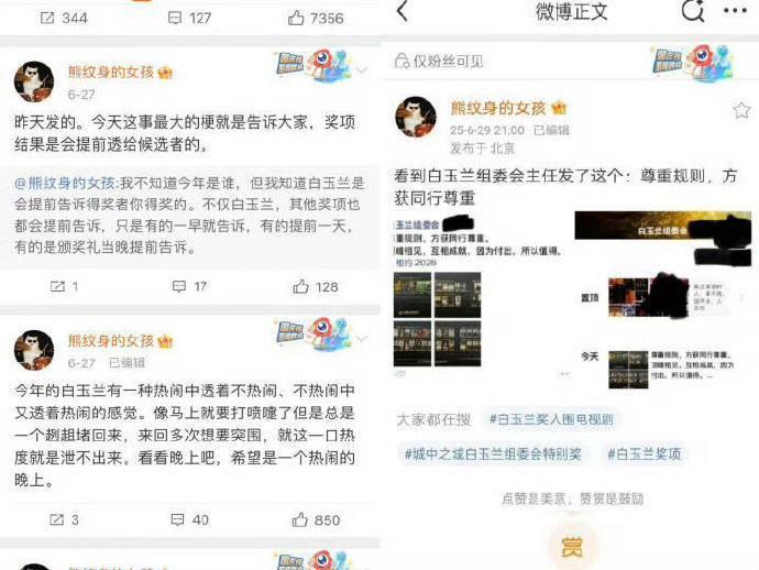 6月30日,微博用户“熊纹身的女孩”发布截图称,“白玉兰组委会主任”朋友圈发文:“尊重规则,方获同行尊重”,被解读为暗指刘亦菲破坏规则,再次引发热议。