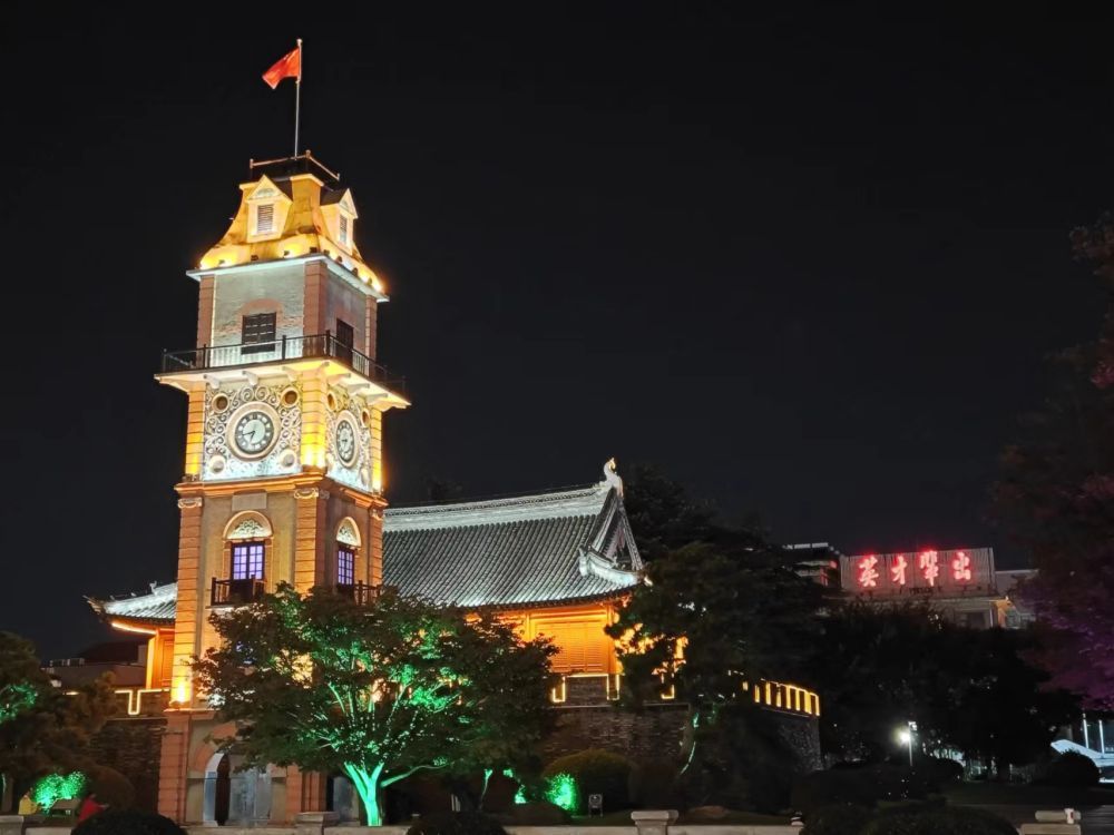 南通市地标建筑钟楼,与悬挂“英才辈出”字样的南通中学紧邻,成为当地一景。新华社记者柯高阳 摄