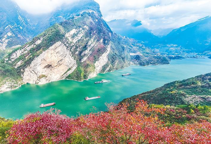 船舶行驶在红叶映衬下的长江三峡西陵峡。(视界网 郑家裕 摄)