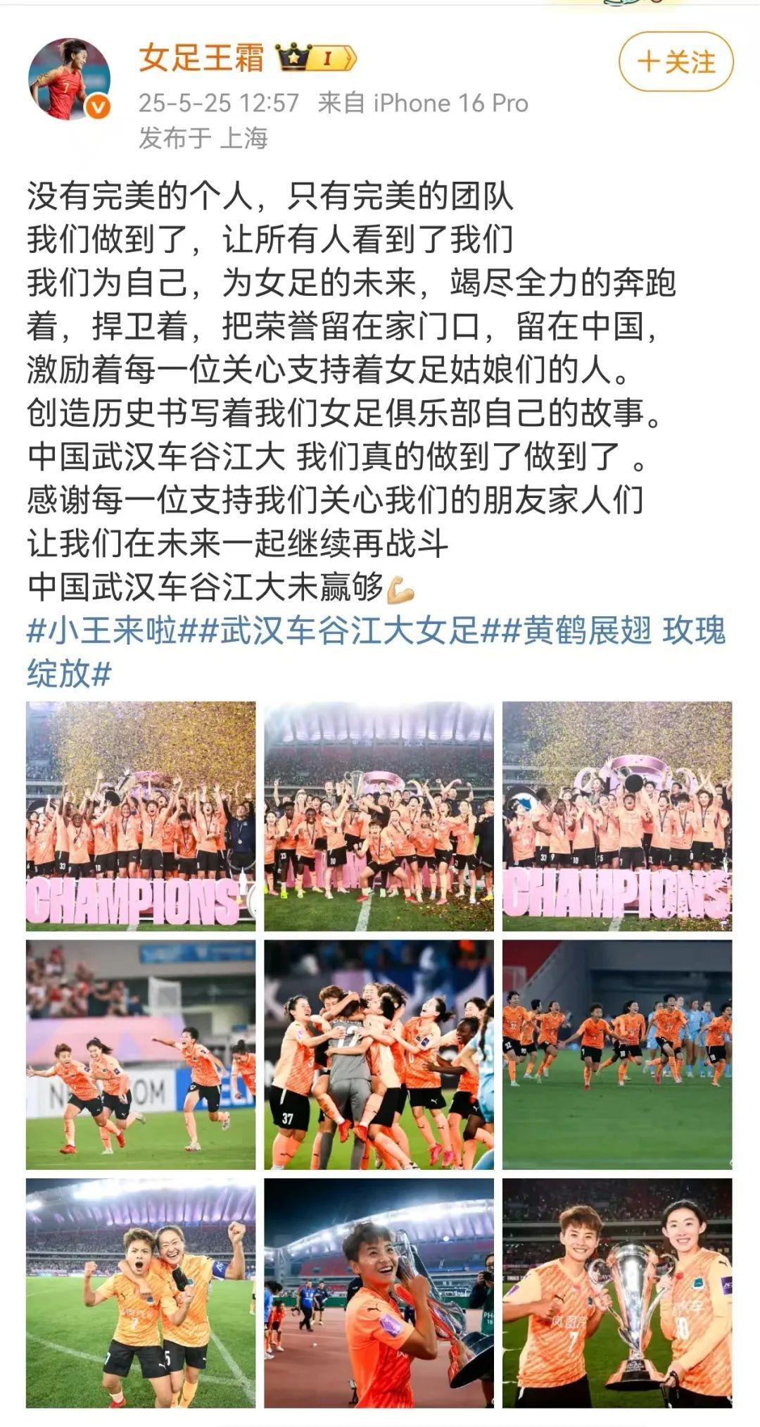 亚冠赛后,王霜在自己的社交媒体上留下这样的字句,“我们做到了,让所有人看到了我们。”诚然,这座亚冠奖杯的背后,重量必是沉甸甸的。