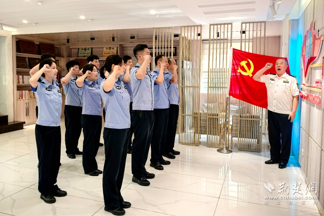 “我志愿加入中国共产党,拥护党的纲领……”在鲜红的党旗下,民警沈胜文领誓,青年民警重温入党誓词,铿锵有力的誓言在活动室回荡。