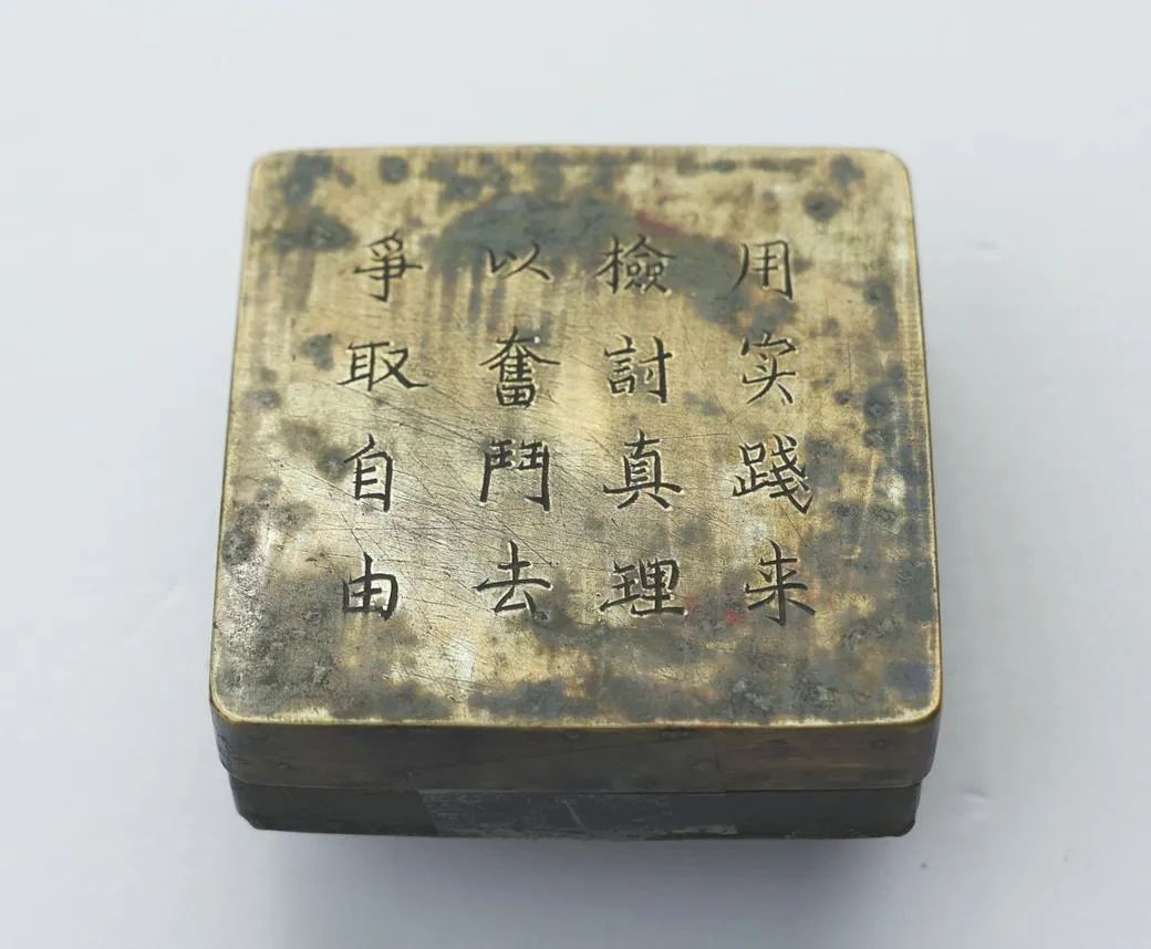 1922年前后,中共湖北某机关使用过的文房墨盒,墨盒纯手工刻铜铭文:“用实践来检讨真理,以奋斗去争取自由”。铜盒盖铭文充分说明,早在建党初期就树立了“求真务实”的理念,此文物是中国共产党最早提出真理标准的有力证明。