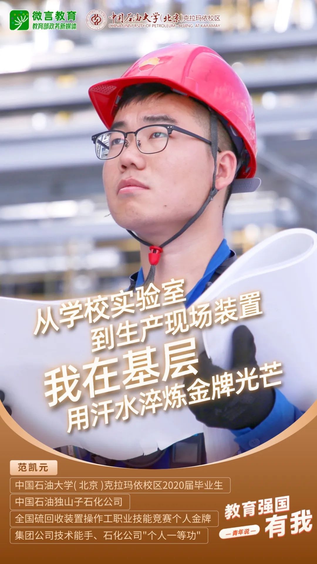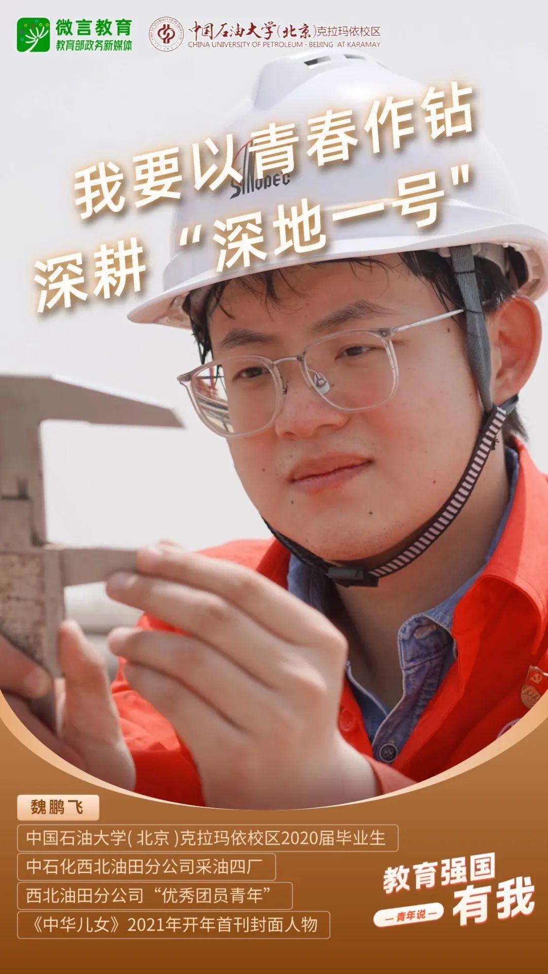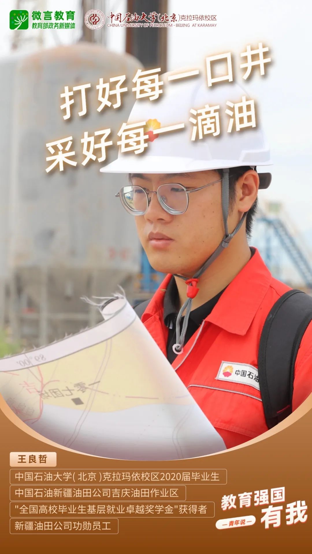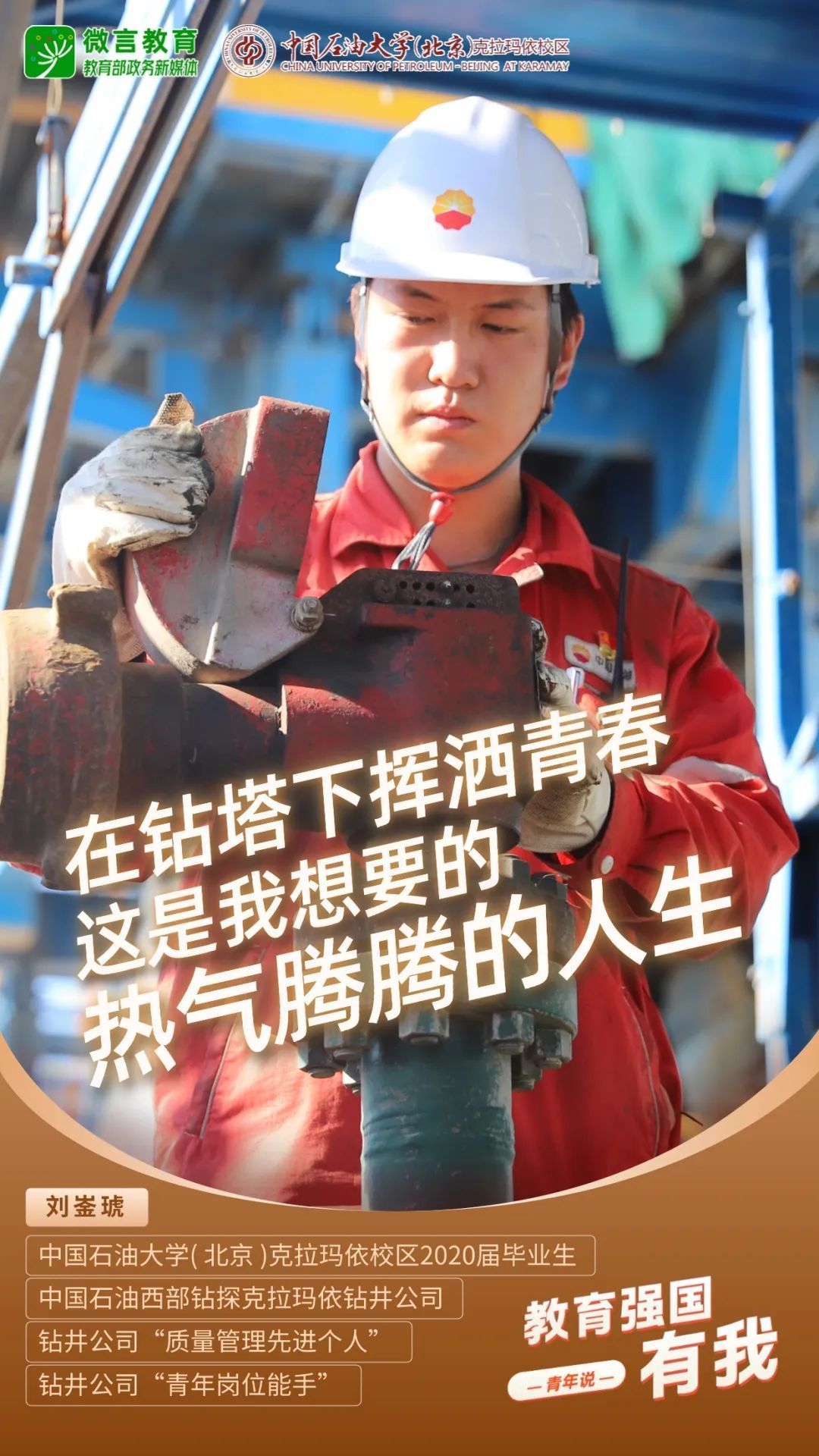 习近平总书记强调,希望广大青年坚定理想信念,厚植家国情怀,练就过硬本领,发扬奋斗精神,到祖国和人民最需要的地方发光发热,为中国式现代化建设贡献青春力量。教育强国建设,青年何为?“七一”之际,教育部政务新媒体推出“教育强国,有我!”网络主题宣传活动之“青年说(报国篇)”系列,展现青年学子将个人理想融入国家发展的青春担当。今天,跟教育小微通过1个视频和1组海报,一起来看中国石油大学(北京)克拉玛依校区学子如何让青春在西部闪光——