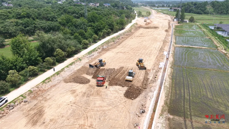 6月18日,在318国道罗田县城至骆驼坳镇段改建工程项目施工现场,运输车往来穿梭,挖掘机相互配合,正在进行土路基建设。