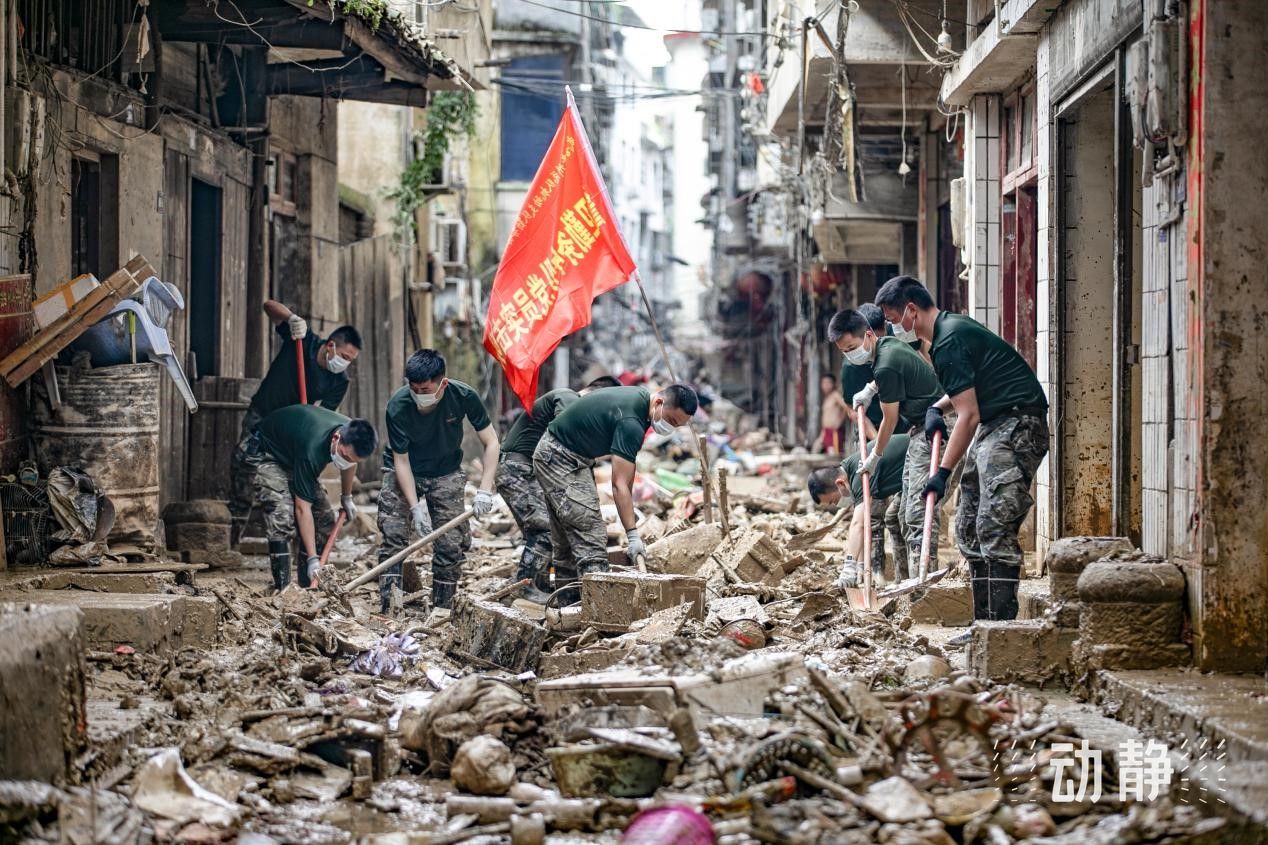 撤离救援现场,武警、消防、公安、民兵,多种救援力量编成一个个党员突击队,争分夺秒转移群众。每一个党员的肩膀扛着的是人民的重量。