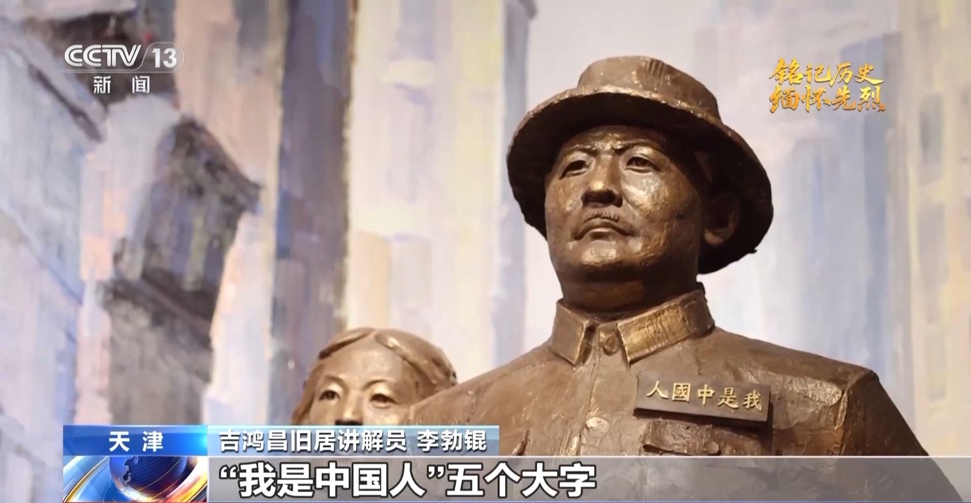 天津吉鸿昌旧居讲解员李勃锟:吉鸿昌在美国前往邮局想往国内邮寄包裹时,邮局的工作人员竟故意声称不知有中国这个国家,吉鸿昌将军十分愤怒。回到住所之后,将军找来一块木牌,在上面工整地刻下了“我是中国人”五个大字,并将其佩戴在胸前,昂首挺胸地出入于大庭广众之中。