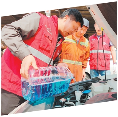 浙江省宁波舟山港,党员货车司机开展车辆检修保养志愿服务。