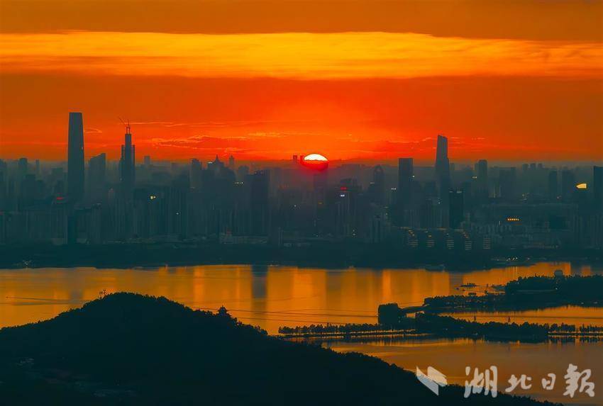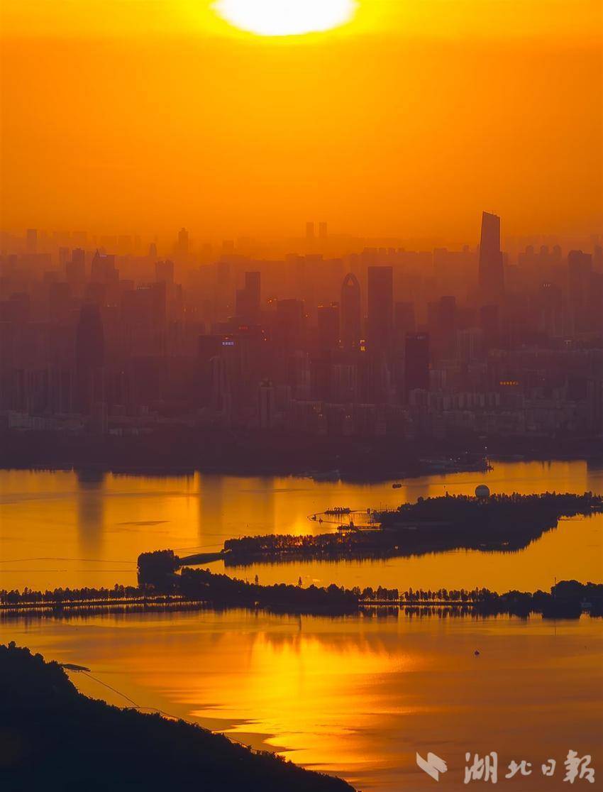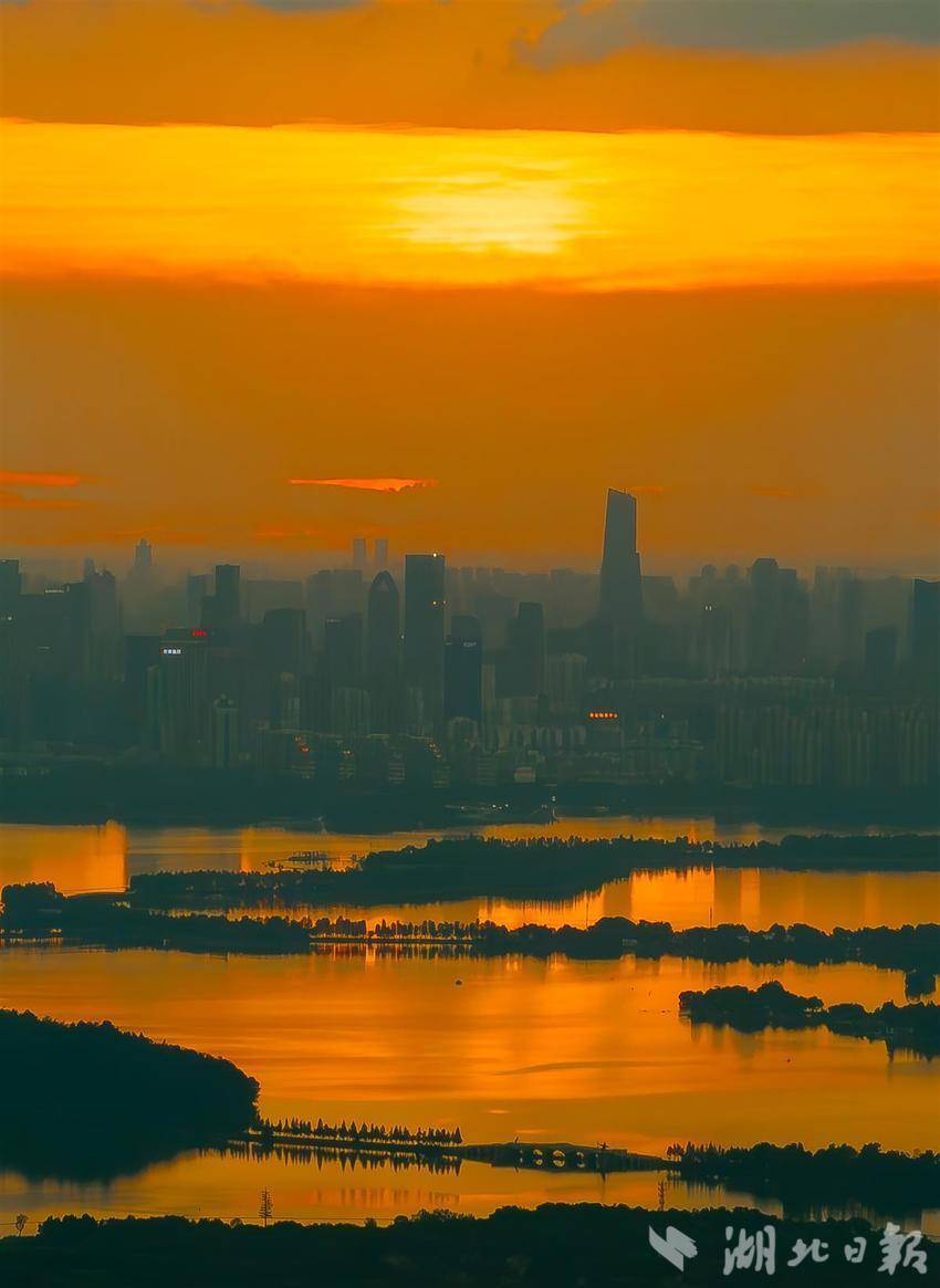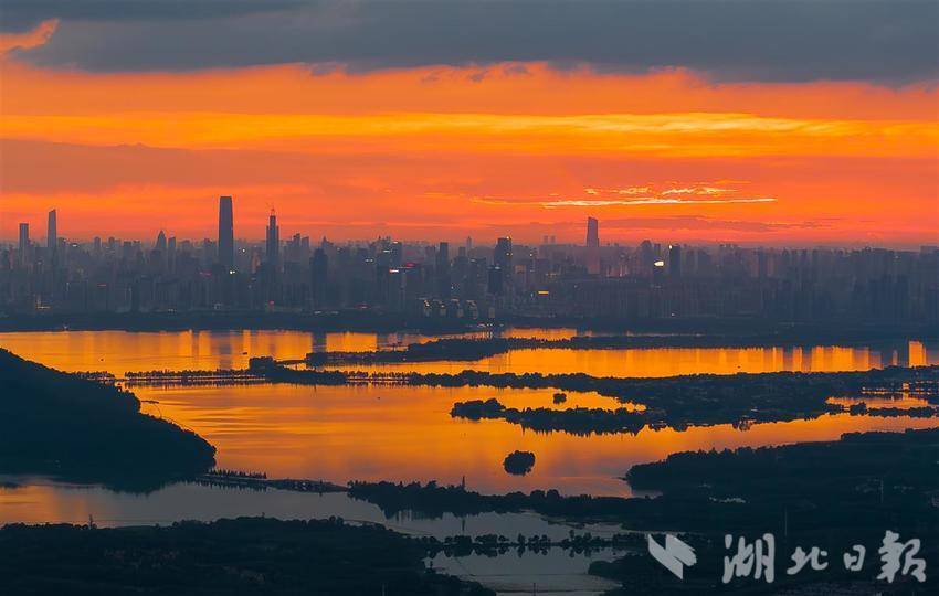 7月2日傍晚,橙红晚霞浸染天空,武汉东湖湖面泛起碎金,东湖绿道和城市轮廓在氤氲暮色中若隐若现。(湖北日报全媒记者 柯皓 摄)