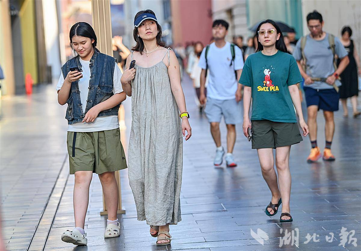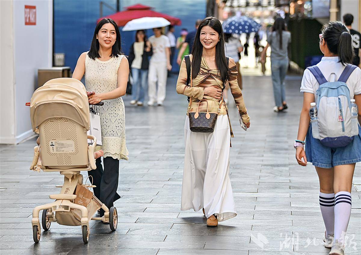 7月2日,武汉最高气温已达36℃,记者在汉街看到,大街上随处可见一身夏装的酷哥靓女,成就夏天一道美丽的风景线。(湖北日报全媒记者 朱熙勇摄)
