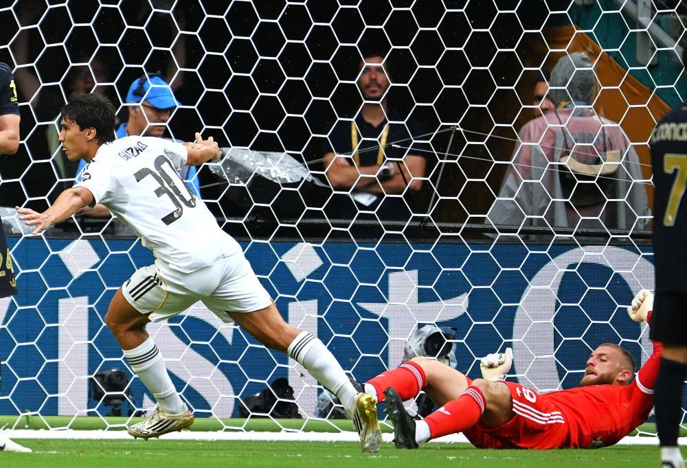 7月1日,皇家马德里队球员贡萨洛·加西亚(左)在头球破门后庆祝