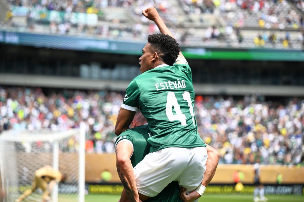 6月28日,帕尔梅拉斯队球员保利尼奥(下)破门得分后与队友埃斯特旺庆祝