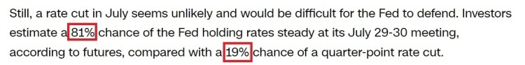 而投资者预计,美联储在7月底举行的下次货币政策会议上继续维持利率不变的可能性达81%,而降息25个基点的可能性仅为19%。