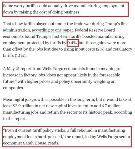 美国富国银行甚至在其分析报告中断言,由于物价上涨和政策不确定性给企业带来压力,就业岗位“在可预见的未来都不太可能出现显著增长”,“即使当前的关税政策保持不变,美国制造业就业的全面复苏看起来也很难实现”。