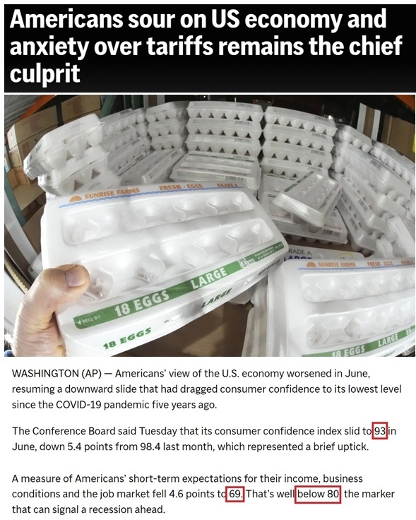 美国智库“世界大型企业研究会”的最新调查数据显示,由于对关税影响感到焦虑,美国6月消费者信心指数(CCI)下滑至93,跌至五年前新冠疫情暴发以来的最低水平。