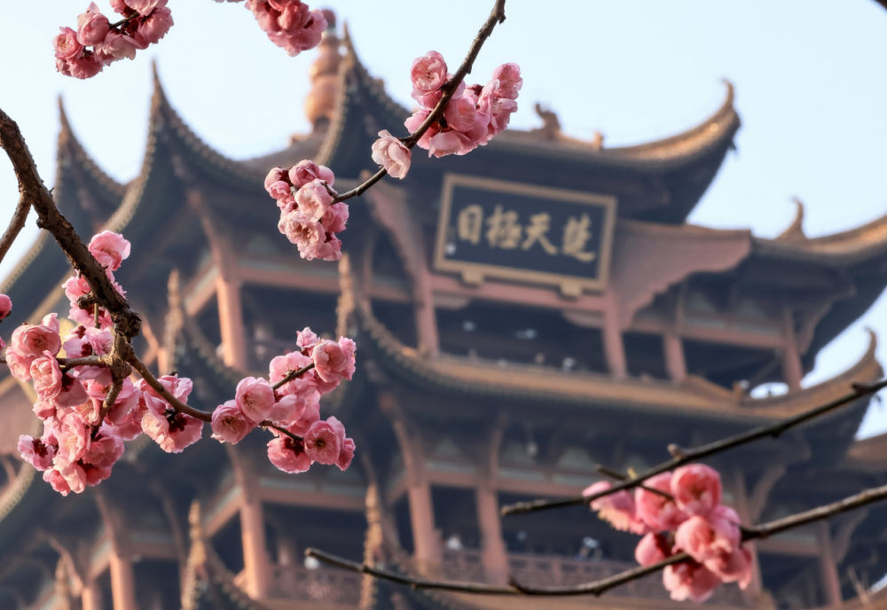 2月15日在湖北省武汉市黄鹤楼公园拍摄的梅花。新华社发(赵军摄)